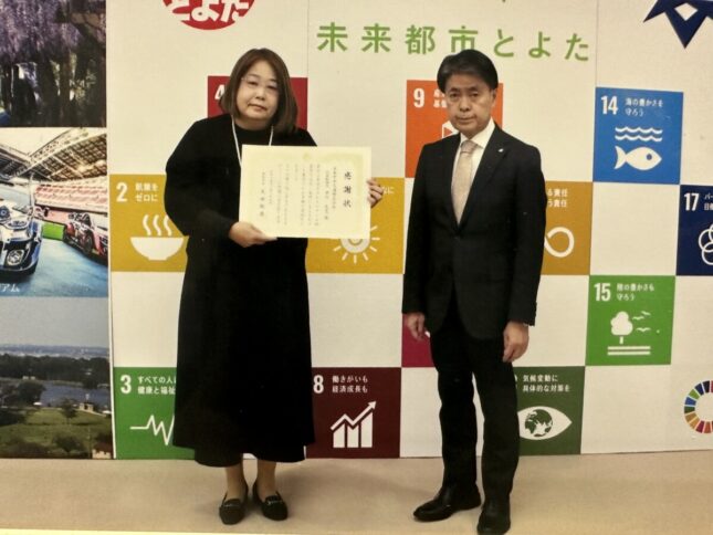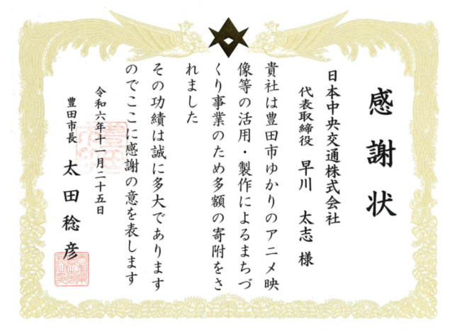 豊田市ゆかりのアニメ映画等を活用した政策による街づくり事業のため、グループ会社より豊田市へ寄付を行い、太田市長より感謝状をいただきました。